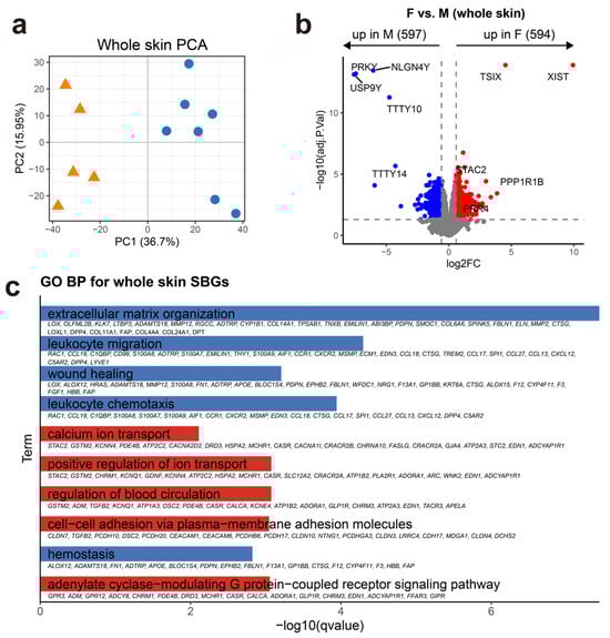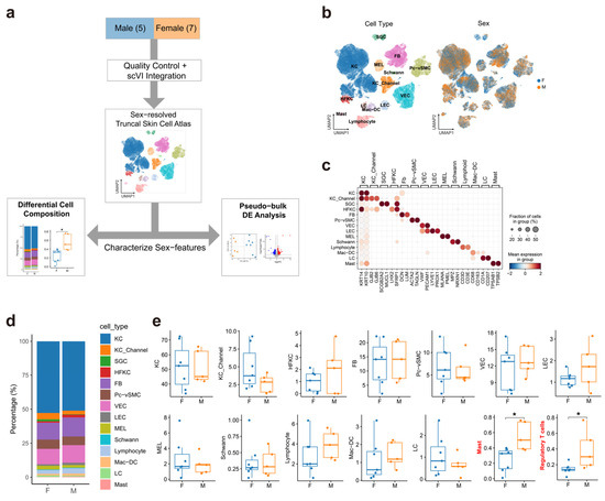 Background/Objectives: Sex differences influence skin physiology, immune regulation, and disease susceptibility, but the cellular organization of sex-biased transcriptional programs in healthy human skin remains incompletely defined. We aimed to define sex-associated differences in cellular composition and gene expression in healthy adult truncal
