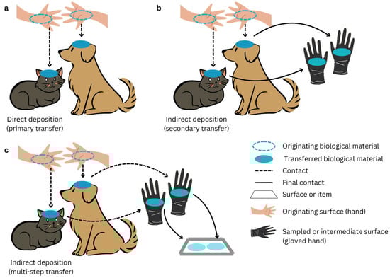 Background/Objectives: The potential role of domestic animals in DNA transfer, persistence, prevalence and recovery (TPPR) warrants careful consideration in forensic contexts. This mini narrative review aims to provide an updated overview of human DNA transfer involving household dogs and cats as vectors, to