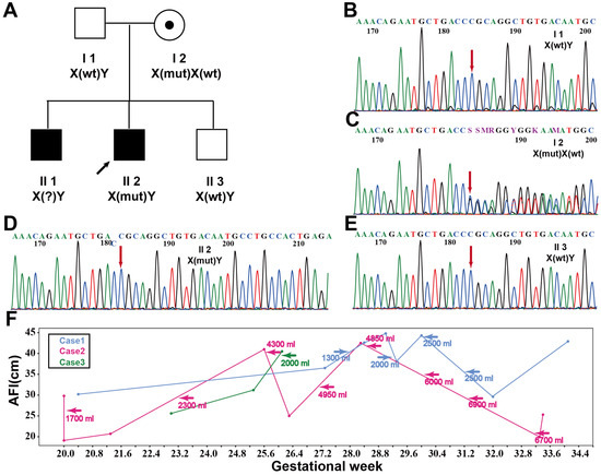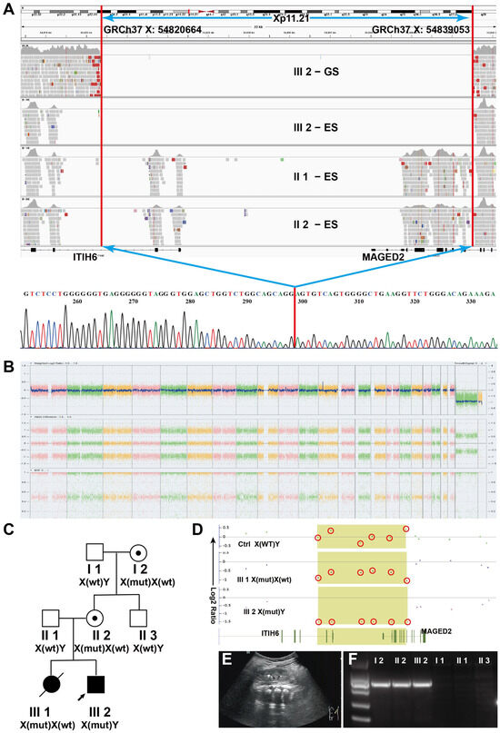 Background/Objectives: We aimed to report three novel MAGED2 variants associated with transient antenatal Bartter syndrome (TABS) and to summarize the prenatal and postnatal features of MAGED2-related TABS through case analysis and literature review. Methods: Three unrelated Chinese families with polyhydramnios-affected pregnancies underwent genetic testing. Clinical data, including prenatal imaging, delivery details, and postnatal outcomes were reviewed. A literature review of reported MAGED2 variants and associated phenotypes was conducted. Results: Three previously unreported MAGED2 variants were identified: two frameshift variants (c.1511del [p.Gly504Alafs*72] and c.338del [p.Pro113ArgfsTer4]) and one deletion (chrX:54,820,664–54,839,053 [GRCh37]). All fetuses presented with polyhydramnios; two were large for gestational age (LGA). Additional findings included ventriculomegaly and scrotal enlargement. Two male infants were delivered at 33 weeks following repeated amnioreduction, with transient postnatal electrolyte abnormalities and normal neurodevelopment at 3 and 4 years. One fetus with a frameshift variant died in utero at 26 + 1 weeks. A literature review of 53 cases revealed 38 distinct MAGED2 variants, predominantly null variants (65.8%). Polyhydramnios was the most consistent antenatal sign. No intellectual disability was reported in surviving individuals. Conclusions: These findings expand the MAGED2 mutational spectrum. Polyhydramnios and LGA represents the most frequent features in TABS. In fetuses presenting with early-onset severe polyhydramnios (around 19–20 weeks of gestation), particular attention should be paid to possible exon-level or partial deletions involving MAGED2 during genetic evaluation.