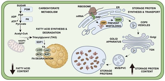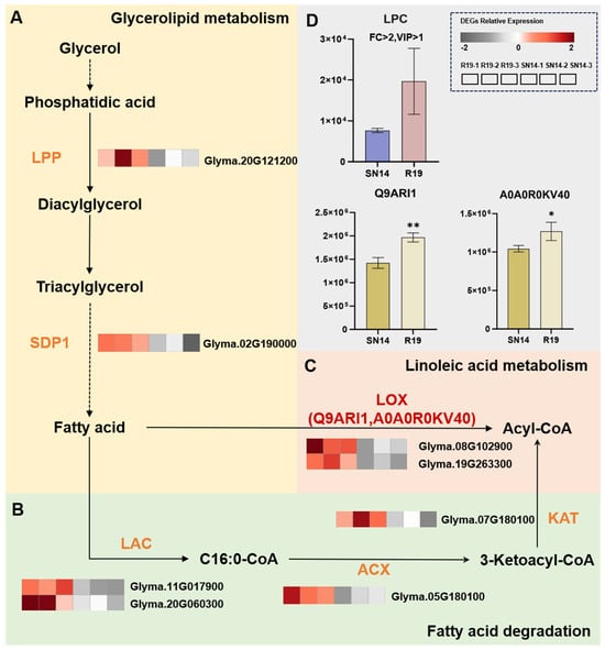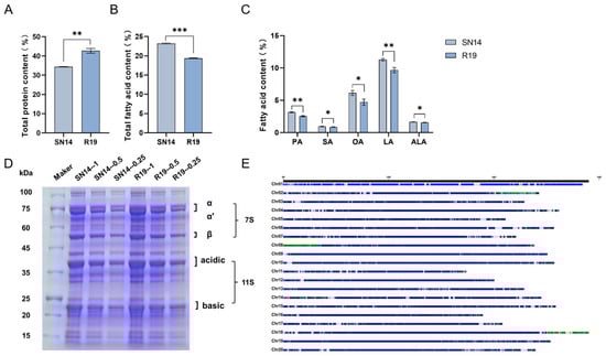 Background/Objectives: The significant negative correlation between protein and oil content in soybean seeds is a long-standing bottleneck for conventional breeding. Its root cause lies in insufficient understanding of related molecular regulatory processes. Methods: We selected the CSSL_R19, a chromosome segment substitution line, to thoroughly investigate the intrinsic effects of the substituted segment on the high seed storage protein (SSP) and low fatty acid (FA) phenotype. Transcriptomic, proteomic, and metabolomic analyses were performed on the recurrent parent and R19. Results: A total of 1821 differentially expressed genes (DEGs), 12 differentially expressed proteins (DEPs), and 10 differentially accumulated metabolites (DEMs) were detected. Subsequently, an integrative examination of the data demonstrated that 28 DEGs, 5 DEPs, and 4 DEMs participated in biological processes such as carbohydrate metabolism, lipid degradation, as well as protein synthesis and transport. Mechanistically, down-regulation of PGM reduces the carbon source supply for FA synthesis; up-regulation of LOX, LACS, ACX, and KAT promotes FA degradation. SRP, SAR1, and HSP70 are involved in the synthesis and transport of SSP. Crucially, qRT-PCR validation performed on all 28 core DEGs showed that their expression trends were highly consistent with the transcriptome data, confirming the reliability of the findings. Conclusions: In conclusion, we propose a potential regulatory network that enhances SSP accumulation and reduces FA content. Altogether, these findings advance our understanding of storage compound accumulation in soybeans and guide future breeding strategies.