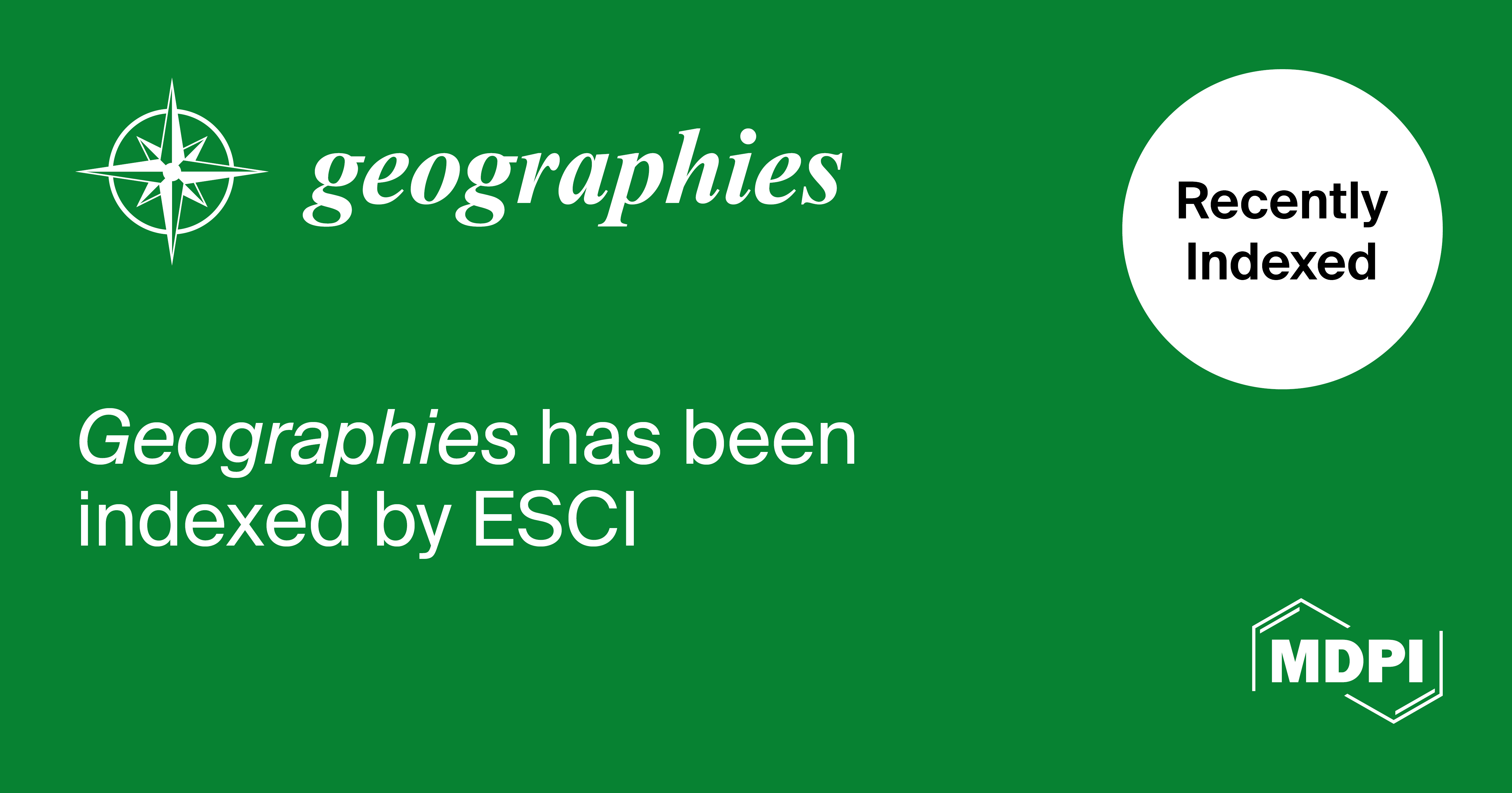 We are pleased to announce that Geographies (ISSN: 2673-7086) has been accepted to be included within the Emerging Sources Citation Index (ESCI) in the Web of Science database. We would like to extend our most sincere gratitude to all the authors, reviewers, and editors who have contributed to this journal and made this achievement possible.