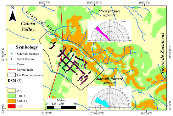 The formation of fractures in urban areas is typically related to construction processes, natural ground settlement, and material quality. In valleys, the distribution of ground fissures is associated with aquifer overexploitation and basement faulting. However, where the soil layer is only a few meters thick or absent, the influence of basement structures remains poorly understood. We hypothesize that urban fractures develop parallel to major basement faults. To test this, we applied a simple structural geology technique to systematically measure extension axes, from street fractures, throughout the town of Las Pilas. These axis orientations were then compared with those calculated for normal faults of Las Pilas Complex. Street fractures are generally about 1 cm thick, with lengths ranging from 0.51 to 1 m and occasionally reaching up to 3 m. They occur within streets 2 to 4 m wide, typically appearing as a single fracture within a 1–2 m wide fracture zone. Based on these characteristics, the fractures do not represent a significant hazard. Measurement results indicate that urban fractures primarily extend in an NE-SW direction. This is consistent with the orientation of the minimum principal stress axis (3) of the regional San Luis-Tepehuanes fault system, thereby supporting our hypothesis.