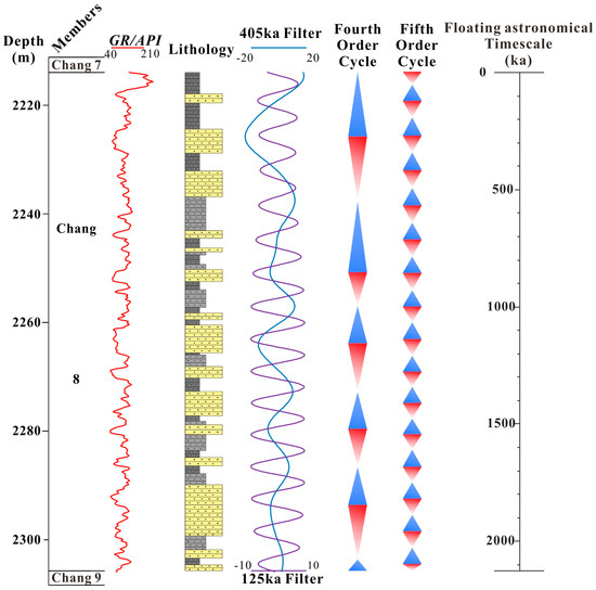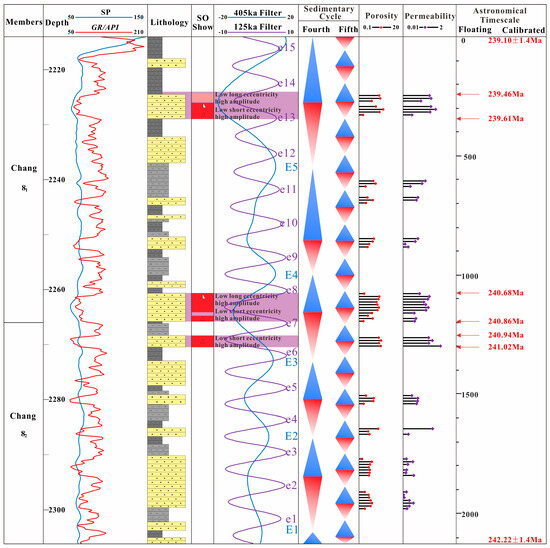 The Chang 8 Member in the Longdong area of the Ordos Basin hosts significant petroleum resources, demonstrating substantial potential for tight oil exploration and development. Astronomical forcing exerts a discernible influence on the evolution of its petroleum system. To elucidate the impact of Milankovitch orbital cycles on organic enrichment and the development of source rocks, reservoirs and cap rocks, we conducted a high-resolution cyclostratigraphic analysis of the Chang 8 Member stratigraphy. This study utilized gamma-ray (GR) well log series as the primary dataset. This lacustrine succession preserves distinct Milankovitch cycles, including ~405 ka long eccentricity, ~125 ka short eccentricity, obliquity, and precession periods, with eccentricity cycles showing particularly strong expression. These diagnostic eccentricity signals provided the framework for delineating high-frequency sequences. Subsequent astronomical tuning and base-level reconstruction constrain the depositional age of the Chang 8 Member to 242.22–241.23 ± 1.4 Ma. During this interval, the lacustrine system exhibited a pronounced trend of base-level fall followed by rise, punctuated by higher-frequency fluctuations. Milankovitch cycles govern the development of high-quality reservoirs and cap rocks and organic enrichment by modulating climate and lake-level fluctuations. These orbital forcings drive weathering processes, control fluvial sediment supply and lacustrine accommodation space, and influence biological productivity. Our results demonstrate a pronounced association between the long eccentricity cycle (~405 ka) and enhanced reservoir quality development, while the short eccentricity cycle (~125 ka) exhibits a stronger correlation with organic matter enrichment, cap rocks, and source rock formation. Ultimately, the interplay of eccentricity cycles jointly governs the formation of the hydrocarbon system within the continental Chang 8 Member.