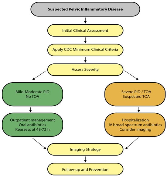 Background: Pelvic inflammatory disease (PID) is a common and potentially severe infection of the upper genital tract. Complications such as tubo-ovarian abscess (TOA), sepsis, and diffuse peritonitis contribute significantly to reproductive morbidity, particularly when diagnosis or treatment is delayed. Aim: The aim of this review is to present an updated, clinically relevant synthesis of the current evidence on the epidemiology, microbiology, diagnostic approach, imaging modalities, and management of PID, with a focus on severe forms including TOA, sepsis, and peritonitis. Content: PID is most frequently initiated by sexually transmitted pathogens—primarily Chlamydia trachomatis and Neisseria gonorrhoeae—which rapidly progresses to a polymicrobial infection involving anaerobic and enteric organisms. Diagnosis is predominantly clinical, supported by nucleic acid amplification tests, inflammatory markers, and imaging. Transvaginal ultrasonography remains the first-line diagnostic approach for suspected TOA, while CT or MRI is reserved for unclear cases or to assess rupture. Mild to moderate disease is managed with broad-spectrum combination antibiotics, whereas severe PID or TOA requires hospitalization, parenteral therapy, and timely source control through image-guided drainage or surgery. Ruptured abscesses and PID-associated sepsis demand urgent surgical intervention and multidisciplinary supportive care. Tailored approaches are necessary in pregnancy, adolescence, and immunosuppressed and postmenopausal patients. Conclusions: Prompt recognition, a low threshold for empiric antimicrobial therapy, the appropriate use of imaging, and decisive escalation to drainage or surgery are essential to limit morbidity and preserve reproductive health. Integrating guideline-based practice with structured clinical pathways may improve outcomes and reduce long-term sequelae of PID.