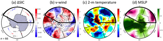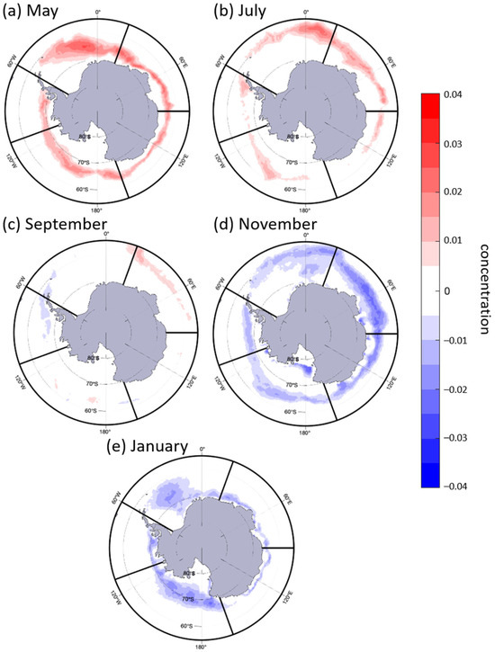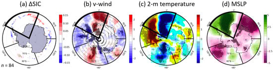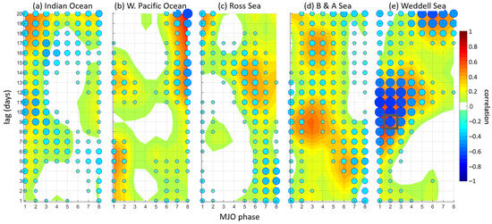 Convection associated with the leading mode of subseasonal variability of the tropical atmosphere, the Madden–Julian Oscillation (MJO), can excite Rossby wave trains that extend well into the extratropics and allow the MJO to modulate many components of the Earth system. To improve our understanding of teleconnections between the MJO and Antarctic sea ice, composite anomalies of daily change in sea ice concentration (ΔSIC) from 1989 to 2019 were binned by phase 0–20 days after an active MJO and compared to anomalies of surface air temperature, the meridional component of surface wind, and sea-level pressure. In May, ΔSIC anomalies were strongest in the Indian Ocean (IO) sector, 16 days after phase 8. There, a wavenumber-three pattern in sea-level pressure anomalies associated with the MJO resulted in anomalously poleward winds and warmer temperatures over the central and eastern IO that were collocated with anomalously negative ΔSIC. Furthermore, anomalously equatorward winds and colder temperatures in the western IO were collocated with anomalously positive ΔSIC. In July, ΔSIC anomalies were strongest in the Weddell Sea (WS) sector nine days after an active MJO in phase 2. There, a wavenumber-three pattern in sea-level pressure anomalies resulted in anomalously poleward winds and warmer temperatures over the western and central WS that were collocated with negative ΔSIC anomalies; anomalously equatorward winds and colder temperatures over the eastern WS were collocated with positive ΔSIC anomalies. In September, the largest ΔSIC anomalies were observed in the IO and WS sectors six days after an active MJO in phase 8. No meaningful modulation of sea ice anomalies was found after an active MJO in November or January. These results extend our understanding of teleconnections between the MJO and Antarctic sea ice on the subseasonal time scale.