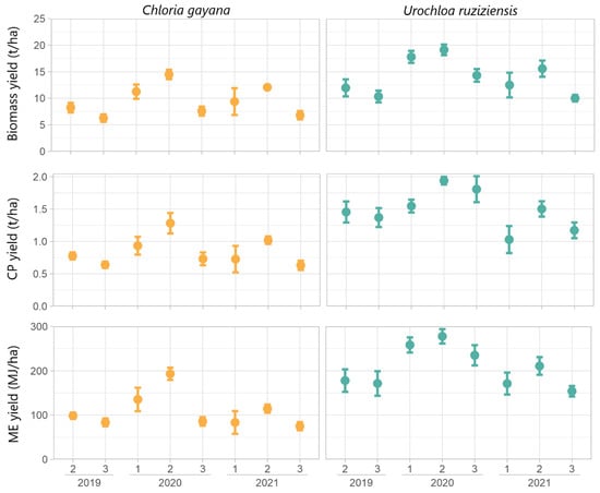 The yield and quality of biomass produced in a growing season determine feed allocation, livestock performance, and system capacity and resilience. Congo grass (Urochloa ruziziensis, UR) and Rhodes grass (Chloris gayana, CG) are important grass species for livestock in