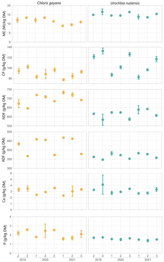 The yield and quality of biomass produced in a growing season determine feed allocation, livestock performance, and system capacity and resilience. Congo grass (Urochloa ruziziensis, UR) and Rhodes grass (Chloris gayana, CG) are important grass species for livestock in Sub-Saharan Africa, where their high yield potential and adaptability provide leverage to mitigate persistent feed gaps. This study investigated the morphological traits, biomass yield, and nutritive value of UR and CG in the Northern Guinea Savanna of Nigeria over three years (2019–2021) to assess their biomass yield and quality responses to successive harvests. We hypothesised that UR would outperform CG in yield and quality over the study period. Grasses were established in 2019, with multiple harvests annually from four replicate plots per species. UR consistently produced more tillers and leaves per tussock and achieved significantly higher biomass and crude protein (CP) yields at each harvest (p < 0.001), averaging 32.2% and 38.4% greater biomass and CP, respectively, compared to CG. Nutritional analysis revealed that CG contained 19.4% less CP, 23.4% less metabolisable energy, and 22.7% less ash than UR, while having higher fibre fractions (p < 0.001). Overall, UR demonstrated superior productivity and nutritional value under the tested conditions, highlighting its potential as a more reliable forage option for farmers in the Northern Guinea Savanna of Nigeria.