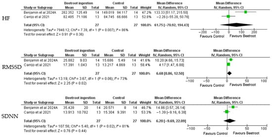 Background/Objectives: Beetroot supplementation is a rich source of inorganic nitrate and has been proposed to enhance nitric oxide bioavailability and support cardiovascular recovery after exercise. This study aimed to evaluate the effects of beetroot supplementation on post-exercise cardiovascular and autonomic recovery in postmenopausal women. Methods: A systematic review and meta-analysis were conducted according to the PRISMA (Preferred Reporting Items for Systematic Reviews and Meta-Analyses) guidelines. Searches were performed in PubMed, Scopus, and Web of Science databases from inception to July 2025. Ten trials involving postmenopausal women were included. Outcomes assessed included cardiovascular measures (blood pressure and vascular function), autonomic parameters derived from heart rate variability (HRV)—specifically the root mean square of successive differences (RMSSD), the standard deviation of normal-to-normal intervals (SDNN), and high-frequency power (HF)—as well as physical performance (peak oxygen uptake [VO2peak or VO2max] and functional fitness tests). Four independent reviewers extracted data, assessed risk of bias, and evaluated the certainty of evidence using the GRADE (Grading of Recommendations, Assessment, Development, and Evaluation) approach. Results: Pooled analyses from two trials (n = 54) revealed a statistically significant improvement in RMSSD with beetroot supplementation (mean difference: 6.68 ms; 95% CI: 0.86 to 12.50; p = 0.02), suggesting enhanced parasympathetic reactivation after exercise. No significant effects were detected for HF (mean difference: 61.75 ms2; 95% CI: −70.92 to 194.43; p = 0.36) or SDNN (mean difference: 6.20 ms; 95% CI: −9.69 to 22.09; p = 0.44). Substantial to considerable heterogeneity was identified across outcomes (I2 = 73–86%). Certainty of evidence was rated moderate for RMSSD, low for SDNN, and very low for HF. Conclusions: Beetroot supplementation may enhance post-exercise autonomic recovery in postmenopausal women, primarily through improvements in RMSSD. However, further trials with standardized protocols, larger samples, and longer intervention durations are required to clarify its impact on broader HRV domains, cardiovascular function, and clinical outcomes.
