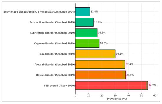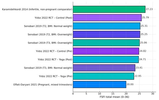 Background and Objectives: Sexual function often fluctuates during pregnancy, yet the contributions of body image-related quality of life (BI-QoL)—operationalized via body image instruments such as the Body Exposure during Sexual Activities Questionnaire (BESAQ) and pregnancy-specific body image scales—and relationship satisfaction remain inconsistently quantified. This systematic review aimed to synthesize evidence on the associations between BI-QoL, relationship satisfaction, and female sexual function in pregnant women. Methods: Following PRISMA 2020, PubMed/MEDLINE, Scopus, and Web of Science were searched up to 23 August 2025. Eligible studies enrolled pregnant women and reported quantitative data on BI-QoL and/or relationship satisfaction alongside sexual outcomes. Risk-of-bias used design-appropriate tools; findings were narratively synthesized due to heterogeneity. Results: Thirteen studies met criteria (predominantly cross-sectional; sample sizes 107–472; one RCT; several couples/longitudinal cohorts). Female Sexual Function Index (FSFI) means clustered in the mid-20s; in a randomized trial, the intervention arm improved FSFI by +1.76 points (22.95 → 24.71; p = 0.002). Overall female sexual dysfunction reached 54.7% in the largest cross-sectional sample. Higher body exposure anxiety was associated with ~4.24-fold greater odds of dysfunction across trimesters. Marital satisfaction explained ≈36% of FSFI variance in multivariable models. Pregnancy context factors related to BI-QoL included planned pregnancy (β = −0.273) and third trimester (β = −0.280) indicating better BI-QoL, while more children predicted worse BI-QoL (β = +0.317). In one cohort, BI during sexual activity worsened postpartum versus pregnancy (p = 0.01). Conclusions: Across diverse settings, poorer BI-QoL and lower relationship satisfaction were consistently linked to reduced sexual function during pregnancy, with desire/arousal most affected. Routine screening and couple-sensitive counseling should be considered as promising, yet still under-tested, strategies that warrant further evaluation in intervention studies.