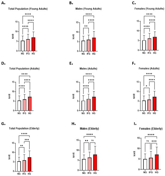Background: Chronic low-grade inflammation and dyslipidemia contribute to metabolic disorders such as diabetes. Dysglycemia, an early stage of glucose dysregulation, reflects this interplay. The neutrophil-to-HDL cholesterol ratio (NHR) integrates inflammatory and lipid pathways, but its role in dysglycemia, particularly in Middle Eastern populations, remains unclear. This study evaluated the association between NHR and glycemic abnormalities, including impaired fasting glucose (IFG) and hyperglycemia (HG). Methods: A retrospective cross-sectional investigation involving 13,121 individuals at a major health setting in Saudi Arabia was conducted. The association between NHR and glycemic status was comprehensively evaluated, with subgroup analyses stratified by age and gender. Risk and diagnostic performance of NHR for dysglycemia were evaluated. Correlation and linear regression analyses were conducted to examine the relationships between NHR and fasting glucose, as well as HbA1c. Results: NHR levels were significantly associated with dysglycemia, showing progressive elevation from normoglycemia (5.30: 3.453–7.755) to IFG (6.00: 3.904–8.663) and HG (7.177: 4.917–10.17). Elevated NHR was more prevalent among individuals with dysglycemia and was associated with an increased risk of IFG (OR = 1.48, 95% CI: 1.36–1.61, p < 0.0001) and HG (OR = 2.38, 95% CI: 2.13–2.65, p < 0.0001). In the FBG context, NHR showed better discrimination of HG from NG than CRP (AUC = 0.650 vs. 0.570; p < 0.0001). Conclusions: Elevated NHR is significantly associated with dysglycemia, particularly hyperglycemia. These findings suggest that NHR may serve as a supportive tool for identifying individuals at increased risk of dysglycemia, especially in populations with limited diagnostic resources. Future longitudinal studies are warranted to validate its predictive and prognostic value in clinical practice.