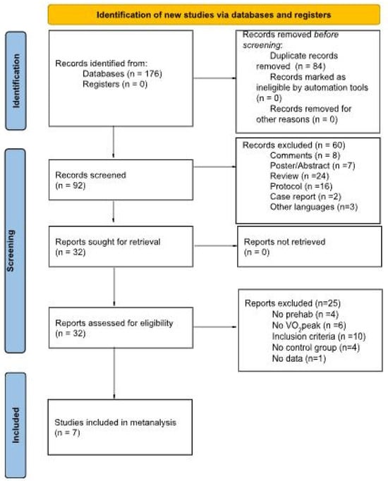 Background/Objectives: Cardiovascular disease is the leading cause of non-cancer mortality in cancer survivors. Exercise interventions are widely used to enhance cardiorespiratory fitness, typically assessed by VO2peak, which predicts postoperative complications and poorer clinical outcomes. Prehabilitation provides an opportunity to optimize health. Given time constraints, high-intensity interval training (HIIT) may represent a time-efficient strategy to improve fitness during prehabilitation. This meta-analysis examines the effects of HIIT-based prehabilitation versus usual care on VO2peak in cancer patients. Methods: A systematic search was conducted in Cinahl, Embase, PubMed, Scopus, and Web of Science from database inception to August 1, 2024 using terms related to cancer, prehabilitation, and HIIT. Random-effects meta-analysis was performed on studies assessing the effects of HIIT versus usual care on VO2peak in adults with cancer undergoing prehabilitation. Seven studies comprising 352 participants (aged 56–73 years) with mixed cancer types were analyzed. Methodological quality was assessed using the Cochrane Risk of Bias tool (v2) and the Consensus on Exercise Reporting Template (CERT). The primary outcome was VO2peak, analyzed using standardized mean differences (SMD) with 95% confidence intervals (CI). Results: The meta-analysis demonstrated a small but statistically significant effect in favor of HIIT over UC (SMD = 0.31, 95% CI = 0.09–0.52, p < 0.01), with low between-study heterogeneity (I2 = 10%). Conclusions: This meta-analysis shows that HIIT-based prehabilitation can improve cardiorespiratory fitness in cancer patients and may provide a clinically relevant, time-efficient strategy to optimize functional capacity before treatment. However, the included studies exhibited substantial clinical heterogeneity, and although all interventions were labeled as HIIT, exercise intensity was not assessed consistently across studies, underscoring the need for cancer-specific randomized controlled trials with standardized HIIT protocols and objective intensity verification.