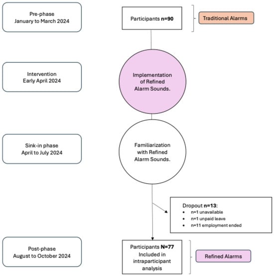 Background: Auditory alarms in patient monitoring are vital for clinical safety, but their harsh acoustic properties and high frequency contribute to stress, alarm fatigue, and reduced acceptance among healthcare staff. In collaboration with Sen Sound, Philips redesigned its alarm sounds to reduce auditory harshness, particularly for low- and medium-priority alarms, while preserving the salience of high-priority alerts. This study evaluated the impact of these refined alarm sounds in a real-world clinical setting. Objective: The goal was to determine whether anesthesia professionals perceive the refined Philips alarm sounds as more pleasant, clinically appropriate, and reliably recognizable compared with the traditional sounds. Methods: We conducted a single-center, pre–post intervention study at the University Hospital Zurich, Switzerland. Anesthesia providers assessed traditional and refined Philips alarm sounds with respect to perceived sound appeal, perceived functionality, and recognition accuracy. The primary outcome (sound appeal) was tested for superiority; using mixed-effects regression models. Results: Seventy-seven participants completed both study phases. Refined alarm sounds significantly improved perceived sound appeal (mean difference +0.51; 95% CI, 0.37–0.64; p < 0.001), while perceived functionality showed a small decrease (mean difference −0.15; 95% CI, −0.27 to −0.03). Recognition accuracy for low- and medium-priority alarms was higher with traditional sounds (low: 95.2% vs. 87.5%, p = 0.002; medium: 81.1% vs. 62.0%, p < 0.001), while high-priority alarms were more accurately identified with refined sounds (89.0% vs. 81.4%, p = 0.002). Overall, 71% of participants preferred the refined sounds, and 92% supported further development. Conclusions: Refined alarm sounds reduced perceived harshness and improved auditory comfort for anesthesia providers, but were associated with slightly lower perceived functionality and mixed recognition accuracy. High-priority alarms were identified more reliably, whereas low- and medium-priority alarms were less distinctly recognized, indicating a limited trade-off between sound appeal and clarity that primarily affected lower-priority signals. These findings suggest that while refinement can enhance the auditory environment, further development, potentially incorporating auditory icons or voice-based alerts, will be needed to optimize both user experience and patient safety in clinical practice.