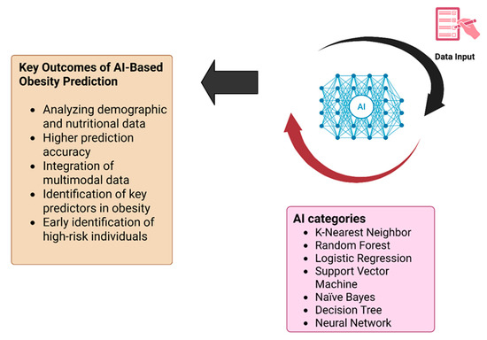 Background/Objectives: Obesity is a complex disorder that causes further health issues linked to several chronic diseases, such as cancer, diabetes, metabolic syndrome, and cardiovascular diseases; thus, it is critical to identify and diagnose obesity as soon as possible. Traditional methods, such as anthropometric measures, were popular, although recent advances in artificial intelligence (AI) offer new opportunities for prediction models; as a result, AI has become an essential tool in obesity research. This study provides a comprehensive analysis of the research on the impact of AI on obesity prevention. Methods: In this study, the researchers performed a scoping study using AI to assess and predict obesity in PubMed, Scopus, Web of Science, and Google Scholar from February 2009 to July 2025. The researchers compiled and arranged the employed AI approaches to find connections, patterns, and trends that could guide further research and the application of machine learning algorithms for advanced data analytics. Results: Clinical professionals in obesity medicine may find chatbots valuable as a source of clinical and scientific knowledge, and for creating standard operating procedures, policies, and procedures. According to the findings, AI models can be used to identify clinically significant patterns of obesity or the connections between specific factors and weight outcomes. Moreover, the application of deep learning and machine learning approaches, such as logistic regression, decision trees, and artificial neural networks, appears to have yielded new insight into data, particularly in terms of obesity prediction. Conclusions: This work aims to contribute to a better understanding of obesity detection. While more studies are needed, AI offers solutions to modern challenges in obesity prediction.