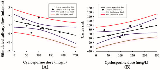 Background: The aim of this study was to investigate the effects of chronic graft-versus-host disease (cGVHD) and its treatment with cyclosporine and extracorporeal photopheresis (ECP) on salivary caries risk factors. Methods: In this exploratory single-centre cross-sectional pilot study, saliva samples from 22 cGVHD patients were analysed for flow rate, pH, buffering capacity, and counts of Streptococcus mutans and Lactobacillus. A detailed dental examination assessed plaque, carious lesions, and their progression. Caries risk was determined based on general health and diet questionnaires and clinical findings. Results: Patients receiving a combination of cyclosporine and ECP had significantly fewer carious teeth, affected tooth surfaces, and non-cavitated carious lesions compared with those treated with ECP alone (Bonferroni test, p = 0.004, p = 0.002, and p < 0.001, respectively). Patients treated with ECP had more carious teeth and affected surfaces than those who did not receive either ECP or cyclosporine (p = 0.008 and p = 0.002), whereas patients treated with cyclosporine only had more non-cavitated lesions than those receiving both cyclosporine and ECP (p < 0.001). A negative correlation was observed between cyclosporine dose and stimulated salivary flow (R = −0.672, p = 0.0486), and a positive correlation between cyclosporine dose and caries risk (R = 0.640, p = 0.0461). Conclusions: The disease and its treatment were associated with reduced salivary flow and increased caries risk. Patients’ oral health should be monitored regularly and managed with care to prevent further deterioration.
