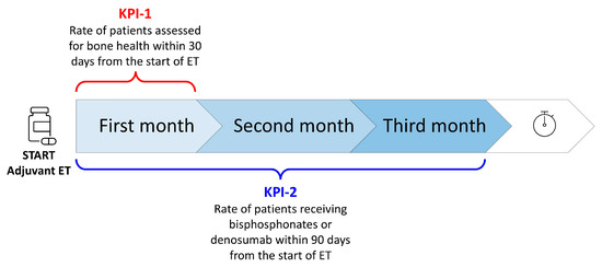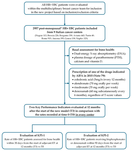 Objective: The Italian Drug Agency (AIFA) Determination n. 589 of 2015 (Note 79) establishes that the use of bisphosphonates or denosumab is necessary for the primary prevention of bone fractures in postmenopausal patients with early breast cancer (EBC) undergoing adjuvant endocrine therapy (ET). Since adherence to the 2015 AIFA recommendation was still very low in 2019, a new bone health management model was identified to improve adherence to this recommendation. Methods: The aim of this project (Predict & Prevent) was to increase the percentage of patients with early breast cancer (EBC) with hormone receptor-positive (HR+) tumors treated. The project identified a new bone health model of management including the following: training of breast multidisciplinary teams and bone health specialists; presentation and implementation of this model in cancer centers; evaluation, at baseline and 12 months after the implementation of the project, of two key performance indicators (KPIs): rate of HR+ EBC patients assessed for bone health within 30 days from the start of adjuvant ET (KPI-1) and rate of HR+ breast cancer patients receiving bisphosphonates or denosumab within 90 days from the start of adjuvant ET (KPI-2). The primary endpoints of this study were the assessment of the rates of the two key performance indicators (KPIs) 12 months after the start of the project (T3) in comparison with the rates recorded at time 0 (T0) in each participating cancer center and the bone fracture rates at 5 years. In this first analysis, we reported the rates of two KPIs 12 months after the start of the new model (T3) and the comparison with the rates recorded at time 0 (T0) in each participating cancer center, to assess whether these percentages had increased after the implementation of the new organizational model. The rates of bone fractures will be evaluated after five years from implementation of this project in every cancer center. Results: From 2020 to 2022, 10 Italian cancer centers were involved in this project. As of September 2023, 9 cancer centers reported rates relative to two KPIs assessed in each hospital. In 6 hospitals (Negrar, Brescia, Bergamo, Aviano, Turin, Rome), the rates relative to KPI-1 and to KPI-2 increased progressively from time T0 (at baseline) to time T3 (after 12 months from the start of the project), due to training of multidisciplinary teams and implementation of a new bone health management model. In the other three cancer centers (Ancona, Genoa, Naples), where the rate of evaluation of bone health (KPI-1) and the indication for bisphosphonates/denosumab (KPI-2) in HR+ EBC patients were already high at time T0, the rates remained high even after 12 months from the start of this project. Conclusions: After 12 months from the implementation of this new organizational model of bone health management, an increase in the rate of postmenopausal HR+ EBC patients on adjuvant ET assessed for bone health and the rate of patients treated with bisphosphonate/denosumab were reported in six out of nine cancer centers. In the other three cancer centers, where the rates were high at baseline, the rates also remained high after 12 months from the new model implementation. This new model should be adopted in all cancer centers to allow adequate management of bone health in all postmenopausal HR+ EBC patients undergoing adjuvant ET, with the ultimate goal of reducing the rate of bone fractures in these patients in subsequent years.