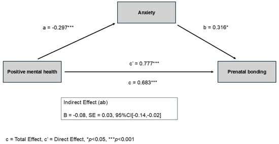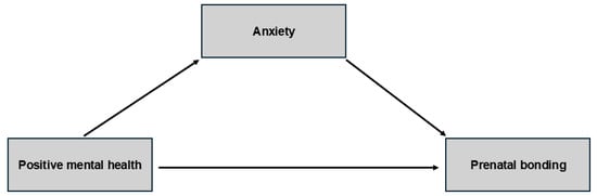 Background/Objectives: The establishment of strong prenatal bonding is a key determinant of perinatal well-being, influencing maternal psychological adaptation and infant development. Numerous studies have examined risk factors and psychopathology during pregnancy, but limited research has explored the role of positive psychological constructs, such as positive mental health (PMH). This study aimed to assess whether anxiety mediates the relationship between PMH and the quality of prenatal bonding. Methods: A total of 90 pregnant women participated. PMH was assessed using the Abbreviated Positive Mental Health Questionnaire; anxiety using the Hospital Anxiety and Depression Scale; and prenatal bonding using the Prenatal Assessment Scale for Pregnant Women (EVAP). A simple mediation model was tested, with anxiety as a mediator between PMH (predictor) and prenatal bonding (outcome), controlling the analysis for previous miscarriages, relationship stability, high-risk pregnancy, and employment. Results: The model revealed partial mediation (F = 16.617, p < 0.001). Higher PMH was associated with lower anxiety (B = −0.297, SE = 0.062, p < 0.001) and stronger prenatal bonding (B = 0.777, SE = 0.091, p < 0.001). Interestingly, anxiety emerged as an adaptive response, which could improve maternal sensitivity and communication with the unborn child (B = 0.316, SE = 0.145, p = 0.032). The model explained 56% of the variance in prenatal bonding, even after accounting for relevant covariates. Conclusions: These findings underscore the importance of considering contextual and psychosocial factors when assessing the role of emotions such as anxiety during pregnancy. Rather than being inherently maladaptive, anxiety may play a functional role in facilitating maternal engagement with the baby, especially when grounded in PMH. Given the limited research, our findings support the integration of positive psychology frameworks into perinatal health interventions.