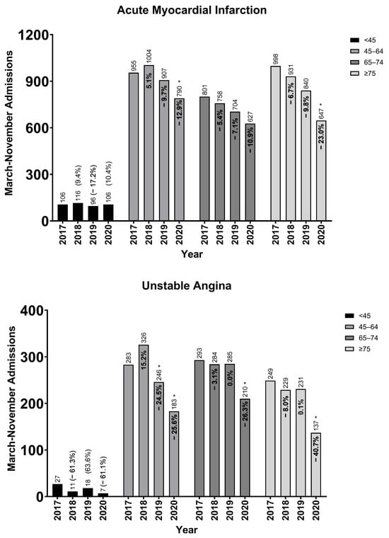 Background/Objectives: This study evaluated the impact of the COVID-19 pandemic on trends of acute coronary syndrome hospitalizations, all-cause deaths, and ischemic heart disease (IHD) deaths in Allegheny County, Pennsylvania. Methods: Inpatient hospital records from two hospital systems within Allegheny County, Pennsylvania, were aggregated from January 2017 to November 2020. The primary diagnoses were acute myocardial infarction (AMI) and unstable angina. The Pennsylvania Department of Health provided all-cause and IHD death counts for the same period. We compared absolute percentage changes in admissions by year (March–November) and trends by age-specific groups (<45, 45–64, 65–74, ≥75) from the pre-pandemic (January 2017–February 2020) to pandemic (March 2020–November 2020) period using an interrupted time-series analysis. Results: There were 11,913 AMI hospitalizations pre-pandemic and 2170 AMI hospitalizations during the pandemic period. AMI hospitalizations decreased by 14.8% and unstable angina hospitalizations decreased by 30.7% during the pandemic compared to 2019, with the largest decreases occurring in those aged ≥75. Total mortality increased by 9.2%, and IHD mortality increased by 2.4%. About 80% of the increase in deaths was due to COVID-19, and approximately 75% of deaths occurred in those aged ≥75 and in long-term care facility residents. Conclusions: The COVID-19 pandemic did not markedly alter the longitudinal declining trend of AMI hospitalizations and IHD deaths in Allegheny County.