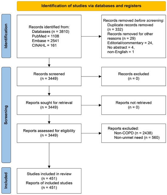 Background/Objectives: Unmet healthcare needs, driven by structural and patient-level barriers, are particularly critical in chronic obstructive pulmonary disease (COPD). However, limited research has examined how academic themes on this topic connect and evolve over time. This study analyzed the structure and temporal shifts