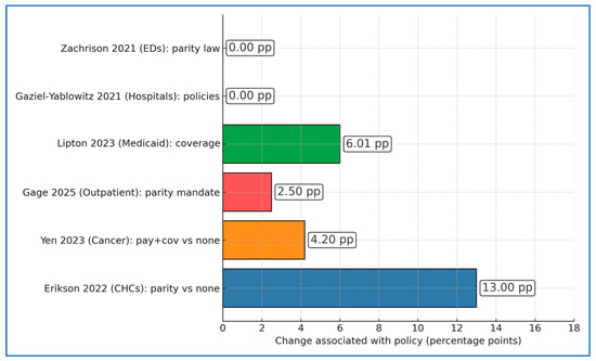 Background and Objectives: Payment parity laws require commercial health plans to pay for telehealth on the same basis as in-person care. We systematically reviewed open-access empirical studies to identify and synthesize empirical U.S. studies that explicitly evaluated state telehealth payment parity (distinct from coverage-only parity) and to summarize reported effects on telehealth utilization, modality mix, quality/adherence, equity/access, and expenditures. Methods: Following PRISMA 2020, we searched PubMed/MEDLINE, Scopus, and Web of Science for U.S. studies that explicitly modeled state payment parity or stratified results by payment parity vs. coverage-only vs. no parity. We included original quantitative or qualitative studies with a time or geographic comparator and free full-text availability. The primary outcome was telehealth utilization (share or odds of telehealth use); secondary outcomes were modality mix, quality and adherence, equity and access, and spending. Because designs were heterogeneous (interrupted time series [ITS], difference-in-differences [DiD], regression, qualitative), we used structured narrative synthesis. Results: Nine studies met inclusion criteria. In community health centers (CHCs), payment parity was associated with higher telehealth use (42% of visits in parity states vs. 29% without; Δ = +13.0 percentage points; adjusted odds ratio 1.74, 95% CI 1.49–2.03). Among patients with newly diagnosed cancer, adjusted telehealth rates were 23.3% in coverage + payment parity states vs. 19.1% in states without parity, while cross-state practice limits reduced telehealth use (14.9% vs. 17.8%). At the health-system level, parity mandates were linked to a +2.5-percentage-point telemedicine share in 2023, with mental-health (29%) and substance use disorder (SUD) care (21%) showing the highest telemedicine shares. A Medicaid coverage policy bundle increased live-video use by 6.0 points and the proportion “always able to access needed care” by 11.1 points. For hypertension, payment parity improved medication adherence, whereas early emergency department and hospital adoption studies found null associations. Direct spending evidence from open-access sources remained sparse. Conclusions: Across ambulatory settings—especially behavioral health and chronic disease management—state payment parity laws are consistently associated with modest but meaningful increases in telehealth use and some improvements in adherence and perceived access. Effects vary by specialty and are attenuated where cross-state practice limits persist, and the impact of payment parity on overall spending remains understudied.