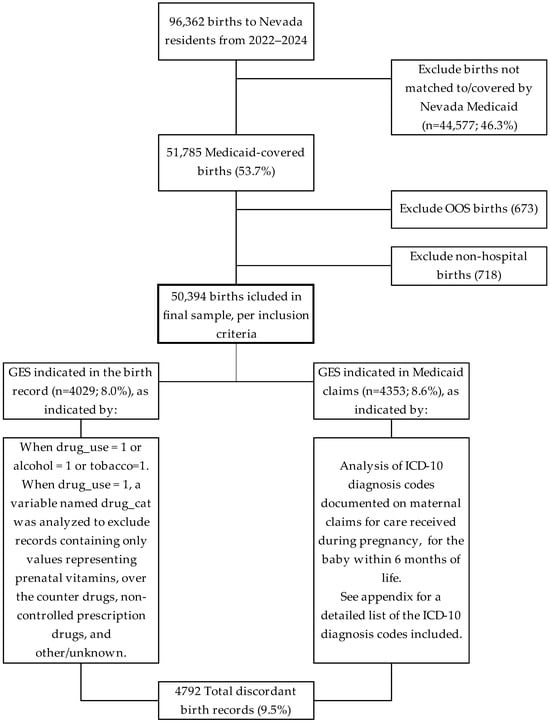 Background/Objectives: Gestational exposure to substances (GES) is associated with adverse developmental outcomes. Early identification is limited by reliance on self-reported data. This study assessed the incidence and predictors of discordance in GES reporting between birth certificates and Medicaid claims among Medicaid-covered births in Nevada from 2022 to 2024. Methods: A statewide, hospital-clustered, cross-sectional analysis was conducted using linked Medicaid billing and birth record data. Discordance was defined as GES identified in one source but not the other. Incidence per 1000 live births was stratified by demographic characteristics. Multilevel logistic regression assessed patient- and hospital-level predictors, with random hospital intercepts. Results: Among 50,394 live births, the discordance rate was 95.09 per 1000 (95% Confidence Interval: 92.5–97.7). Substantial disparities were observed by race/ethnicity, socioeconomic status, and geography, with higher discordance among White non-Hispanic mothers, those residing in rural or frontier counties, and individuals with lower educational attainment or living in lower-income areas. Modest but meaningful variation was also observed across hospitals, including differences by hospital size and teaching or research status. Conclusions: Findings highlight substantial discordance in GES reporting and underscore the limitations of single-source surveillance. Findings also have clear policy relevance, indicating that improved cross-system data integration would strengthen statewide surveillance, enhance early detection, and support more equitable resource allocation and intervention strategies.