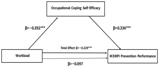 Background/Objectives: Medical device-related pressure injury (MDRPI) is a significant patient safety issue associated with increased morbidity, prolonged hospitalization, and healthcare costs. Although evidence-based guidelines for MDRPI prevention exist, nurses’ prevention performance remains suboptimal, and the mechanisms linking workload to preventive practice remain insufficiently elucidated. Within a patient safety and quality improvement framework, this study aimed to examine whether occupational coping self-efficacy (OCSE) is statistically consistent with an indirect association linking nurses’ workload and MDRPI prevention performance across the nursing practice continuum. Methods: This descriptive correlational study used a mediation model with data from 181 registered nurses working in intensive care units, general wards, and integrated nursing care wards in South Korea. Workload, OCSE, and MDRPI prevention performance were measured using validated instruments. Mediation was tested using hierarchical regression and bootstrapped analysis (PROCESS macro Model 4, 5000 resamples), controlling for demographic and work-related variables. Results: Higher workload was associated with lower OCSE, while higher OCSE was associated with better MDRPI prevention performance. When OCSE was included in the model, the direct association between workload and prevention performance was no longer significant. Bootstrapping confirmed a significant indirect association through OCSE, consistent with a full mediation pattern. Conclusions: Nurses’ workload appears to be indirectly associated with MDRPI prevention performance through OCSE. These findings suggest that strengthening nurses’ coping self-efficacy, alongside organizational strategies, may be essential for sustainable MDRPI prevention and patient safety improvement.
