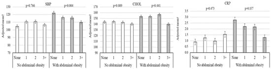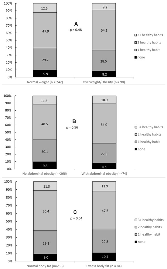 Background/Objectives: The present study aimed to examine how obesity and its distribution influence the relationship between healthy lifestyle habits and cardiometabolic health indicators in adolescents. Methods: This cross-sectional study included 340 adolescents (54.8% female; mean age, 16.6 ± 1.0 years) from Brazil. The cardiometabolic variables included systolic (SBP) and diastolic blood pressure (DBP), high-sensitivity C-reactive protein (CRP), and markers of lipid and glucose metabolism. Information on regular physical activity, healthy diet, reduced alcohol consumption, and non-smoking was collected via a self-reported questionnaire. Body mass index, waist circumference, and skinfold measurements were assessed to determine general obesity, abdominal obesity, and excess body fat, respectively. Multiple linear regression, adjusted for confounding factors, was employed for the analysis. Results: The adoption of ≥3 healthy lifestyle habits was directly associated with high-density lipoprotein cholesterol (up to 1.2 mg/dL) and inversely associated with triglycerides (up to −0.11 p.p.). Engaging in multiple healthy lifestyle habits was inversely associated with SBP among adolescents with general (p = 0.018) and central obesity (p = 0.004). Furthermore, the adoption of multiple healthy lifestyle habits was inversely associated with CRP in adolescents with central obesity (p = 0.037). Conclusions: Even in adolescents with obesity, it is speculated that the adoption of healthy habits may contribute to a reduction in cardiometabolic risk, given the inverse association with SBP in those with general and central obesity and the inverse association with CRP in adolescents with central obesity.
