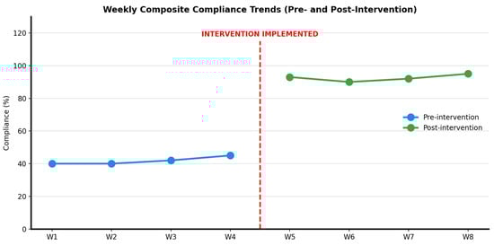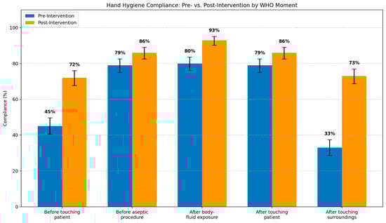 Background/Objective: Hand hygiene is a cornerstone of infection prevention; however, compliance is inconsistent in intensive care units (ICUs), particularly in resource-constrained settings. This study evaluated whether a low-cost, multimodal quality improvement intervention could improve process-level hand hygiene compliance using routine, episode-based audits embedded in the ICU practice. Methods: We conducted a single-cycle Plan-Do-Study-Act quality improvement project in a 12-bed mixed medical–surgical ICU in Pakistan (December 2023–January 2024). Hand hygiene performance was assessed using the unit’s routine weekly episode-based audit protocol, aligned with the WHO Five Moments framework. A targeted multimodal intervention comprising education, point-of-care visual reminders, audit feedback, and leadership engagement was implemented between the pre- and post-intervention phases (four weeks each). Non-applicable moments were scored as “compliant by default” according to the institutional protocol. A sensitivity analysis was performed excluding these moments to calculate pure adherence. Compliance proportions were summarized using exact 95% Clopper–Pearson confidence intervals without inferential testing. Results: A total of 942 audit episodes (471 per phase) generated 4710 moment-level assessments were generated. Composite hand hygiene compliance increased from 63.1% pre-intervention to 82.0% post-intervention [absolute increase: 18.9 percentage points (pp)]. Sensitivity analysis excluding non-applicable moments demonstrated pure adherence improvement from 54.2% to 82.5% (+28.3 pp), confirming a genuine behavioral change rather than a measurement artifact. Compliance improved across all five WHO moments, with the largest gains in awareness-dependent moments targeted by the intervention: before touching the patient (+27.0 pp) and after touching patient surroundings (+40.0 pp). Week-by-week compliance remained stable within both phases, without immediate post-intervention decay. Conclusions: A pragmatic, low-cost multimodal intervention embedded in routine ICU workflows was associated with substantial short-term improvements in hand hygiene compliance over a four-week observation period, particularly for awareness-dependent behaviors. Episode-based audit systems can support directional process monitoring in resource-limited critical care settings without the need for electronic surveillance. However, its long-term sustainability beyond one month and generalizability to other settings remain unknown. Sensitivity analyses are essential when using “compliant by default” scoring to distinguish adherence patterns from measurement artifacts.