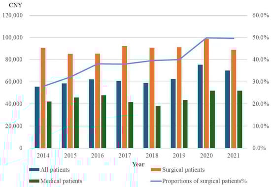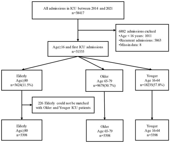 Background/Objectives: Elderly patients represent a growing proportion of ICU admissions, raising concerns about outcomes and healthcare costs. Evidence from China remains limited, yet understanding cost and mortality patterns is critical for optimizing care in aging populations. Methods: We retrospectively analyzed 31,535 ICU patients admitted from 2014 to 2021. After 1:1:1 matching on severity, comorbidities, sex, and admission type, three groups were formed: elderly (≥80 years), older (65–79 years), and younger (16–64 years), with 3398 patients each. Costs were inflation-adjusted, and outcomes compared across groups with appropriate statistical models. Results: Elderly patients accounted for 11.5% of admissions, had the longest ICU stay (4.5 vs. 3.8 vs. 3.1 days, p < 0.001), and the highest ICU (11.5%) and hospital (13.5%) mortality. Among non-surgical patients, elderly incurred the lowest costs; however, surgery reversed this pattern, producing a 124% increase. Expenditures were mainly driven by drugs and consumables. From 2014 to 2021, consumables rose from 32.0% to 42.0% of total costs, whereas drug costs declined. Inflation-adjusted hospital costs remained stable over time, while mortality among elderly patients decreased significantly (19.5% in 2014 vs. 8.8% in 2021; OR 0.86 per year, p < 0.001). Conclusions: Elderly ICU patients demonstrate unique cost and outcome profiles. While non-surgical elderly patients are less costly, surgery substantially increases expenses. Mortality declined over time without a rise in real costs, suggesting improved efficiency of critical care. These findings support tailored resource allocation and policy planning for aging ICU populations.