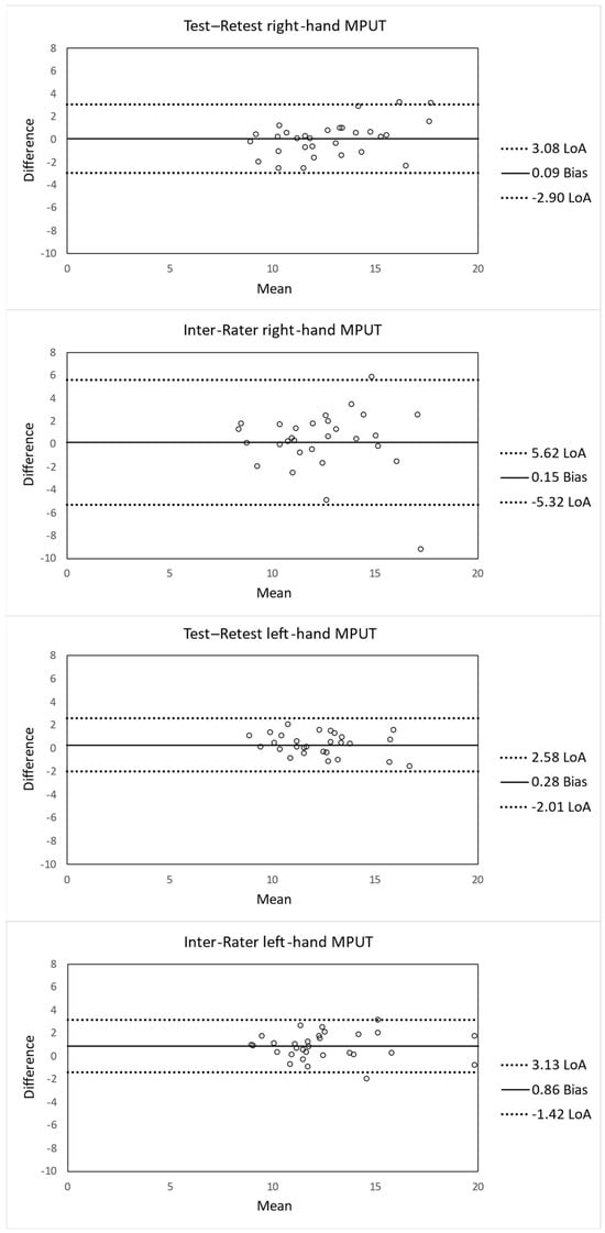Background/Objectives: Haemophilia-related bleedings primarily affect the musculoskeletal system, and functional tests are used in clinical management. Yet, fine motor skills of the upper extremities have not been evaluated in adult persons with haemophilia (PwH). The Moberg Pick-Up Test (MPUT) assesses fine motor skills but has only been psychometrically evaluated in other cohorts. This study aims to examine its psychometric properties in PwH. Methods: A total of 40 moderate or severe PwH A or B were included. The MPUT, consisting of three trials, was conducted twice by rater A and once by rater B. The best performance per hand of each MPUT was used. Subjective hand function (Duruöz Hand Index (DHI) and numeric rating scale (NRS)), elbow joint status (Haemophilia Joint Health Score (HJHS)), pain (NRS), and wrist range of motion (ROM) were utilised for convergent validity evaluation. Inter-rater and test–retest reliability were determined through intraclass correlation coefficients (ICCs) for raw and log10-transformed data. Results: Inter-rater and test–retest reliability demonstrated moderate-to-excellent ICCs for both data types (ICC range: 0.624–0.918). The DHI correlated moderately with the average MPUT score of both hands (r = 0.410; p = 0.016). Left-hand MPUT scores did not correlate with left elbow HJHS scores, whereas right-hand MPUT scores correlated with right elbow HJHS scores (r = 0.396, p = 0.018). Subjective left-hand function (NRS) correlated with the results of the MPUT (r = 0.433; p = 0.009). Conclusions: The MPUT is a reliable and partially valid tool and can be useful to assess fine motor skills in PwH.