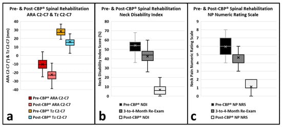 Background/Objectives: Motor vehicle collision (MVC) cervical acceleration–deceleration (CAD) spine injuries are prevalent, costly, and complicated conditions. CAD injuries, or whiplash-associated disorders (WAD), present with neuromusculoskeletal signs and symptoms. In total, 50% of MVC WAD/CAD injuries result in chronic neck-related disability, of which 30% are moderate-to-severe. Poor recovery is associated with little-to-no recovery after 3 months. This study reports on health outcomes of patients with MVC/CAD injuries treated with Chiropractic BioPhysics® (CBP®) spinal rehabilitation beyond little-to-no recovery in neck pain (NP) and disability after 3-to-4 months. Methods: This multicenter retrospective consecutive series reports on patients who met inclusion/exclusion criteria from a records review from two private practices with advanced training in CBP®. Results: In total, 51 patients (26 males), 18–74 years-of-age (mean age 42.8 ± 3.6 years), presented with post-MVC NP and disability. Pre-treatment radiographs revealed decreased cervical curvature (ARA C2-C7) measuring −10.3 ± 2.0° (ideal is −42.0°) and anterior head translation (Tz C2-C7) measuring 28.5 ± 2.0 mm (ideal is 0 mm). The pre-treatment NP numeric rating scale (NRS) scored 6.0 ± 1.0, and the neck disability index (NDI) scored 54.3 ± 9.3% (severe). Patients were treated using CBP® for 64.5 ± 4.7 visits over 31.6 ± 3.7 weeks. Post-treatment radiographs revealed an improved ARA C2-C7 to −22.5 ± 2.3° and Tz C2-C7 to 15.9 ± 1.6 mm (p < 0.001). Subsequent 3-to-4-month re-exam showed little-to-no change in NP and disability outcomes. Post-treatment outcomes at a mean 18.5 weeks after the 3-to-4-month re-exam showed significant (p < 0.001) improvements in NP NRS to 1.1 ± 0.7 and NDI to 6.8 ± 5.5 (minimal). Conclusions: CBP® improves cervical lordosis and posture, which may help improve moderate-to-severe WAD/CAD spine injuries beyond 3-to-4 months of little-to-no recovery.
