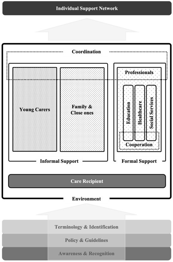 Background/Objectives: Children and adolescents who care for family members with illness, disability, or mental health conditions face challenges across educational, health, and psychosocial domains. Although research and practice have developed conceptual models and assessment tools to better understand and address young carers’ situations, a persistent gap remains between their needs and available support, reflecting structural fragmentation across health, education, and social care systems. To address this gap, this article presents the development of a family-centred framework spanning these sectors. Methods: The framework was developed through an iterative, empirically grounded process based on two studies within a larger research project on young carers in Switzerland. Key themes, structural challenges, and support-related factors were identified by systematically synthesising the findings of the two studies and integrated into an overarching framework linking young carers’ family contexts with cross-sectoral service structures. Results: The Caring in Context Framework synthesises empirical findings into a coherent framework for understanding and addressing young carers’ situations. By systematically extending the whole family approach to include a cross-sectoral dimension, it bridges relational family dynamics and structural service contexts. Sustainable support is conceptualised as dependent on the structural visibility and institutional recognition of young carers across all system levels, positioning identification and recognition as prerequisites for coordinated responses in research, policy, and practice. Conclusion: The framework advances conceptual clarity by integrating family-centred and cross-sectoral perspectives. Rather than creating new services, it emphasises adapting and coordinating existing structures while ensuring systematic recognition of young carers to support coherent, sustainable, and inclusive strategies.