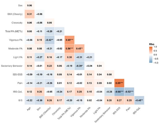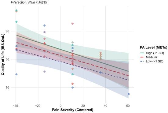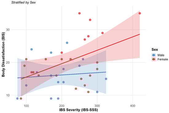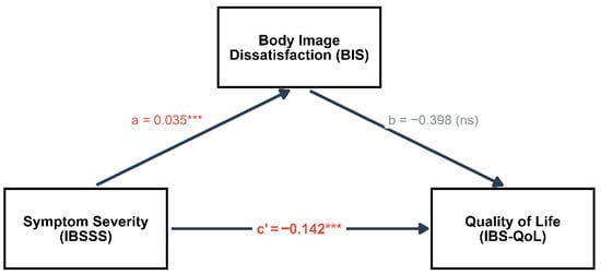 Background: Irritable Bowel Syndrome (IBS) exerts a profound burden on Health-Related Quality of Life (HRQoL) and psychosocial well-being. While lifestyle changes are recommended, the dose–response relationship between physical activity (PA) intensities, symptom severity, and body image remains unclear. This study analyzed the interrelationships between PA intensities, symptom severity, body image satisfaction, and HRQoL in IBS patients. Methods: A cross-sectional study was conducted with 40 adult patients (60% female; 32.53 ± 12.54 years) diagnosed via Rome III/IV criteria. Validated instruments were used to assess PA (IPAQ-SF), sedentary behavior (SBQ), HRQoL (IBS-QoL), symptom severity (IBS-SSS), and body image (BIS). Data were analyzed using Quantile Regression, Robust Linear Regression, and Causal Mediation Analysis. Results: Participants reported moderate symptom severity (210.1 ± 79.2) and high sedentary time (511.1 ± 265.0 min/day). Quantile Regression showed no statistically significant associations between PA intensities and clinical severity (all p ≥ 0.289). PA did not moderate the negative relationship between pain and HRQoL (p = 0.738). However, symptom severity was a significant predictor of body dissatisfaction (β = 0.36, p < 0.001). A sexual dimorphism was observed, as women exhibited higher baseline dissatisfaction and greater sensitivity to symptom worsening than men (β = −0.50, p = 0.004). Conclusions: Symptom severity is strongly associated with body dissatisfaction in IBS, particularly among women, independent of nutritional status. While PA did not directly mitigate symptoms in this cohort, the significant relationship with body image underscores the need for clinical interventions to integrate psychosocial support to address perceptual vulnerability.