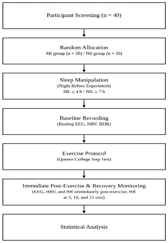Objective: This study examined whether changes in electroencephalography (EEG)-derived indices, photoplethysmography (PPG)-derived autonomic nervous system indices, heart rate, and rating of perceived exertion (RPE) post-high-intensity exercise differ depending on sleep duration. Methods: Forty physically healthy female university students in their twenties were randomly assigned to the sleep restriction (SR) or normal sleep (NS) group. EEG-derived indices—the theta-to-beta ratio (TBR) and spectral edge frequency at 90% (SEF-90)—and PPG-derived autonomic nervous system indices (HRV index, sympathetic activity, and parasympathetic activity) were measured for one minute at rest before exercise and for one minute immediately after exercise. Heart rate was assessed at rest, immediately after exercise, and at 5, 10, and 15 min post-exercise. The group × time interaction effects were assessed using two-way mixed-design analysis of variance, followed by post hoc analyses. Results: TBR increased significantly post-exercise in the SR group (p = 0.002) with no significant change in the NS group. SEF-90 decreased significantly in the SR group (p < 0.001) with no significant change in the NS group. The HRV index decreased significantly in the SR group (p = 0.004) with no significant change in the NS group. Sympathetic activity increased and parasympathetic activity decreased significantly in the SR group (both p < 0.001). Heart rate was significantly higher in the SR group at rest (p < 0.001), immediately after exercise (p = 0.020), and 5 min post-exercise (p = 0.009). RPE was significantly higher in the SR group (p = 0.003). Conclusions: In healthy young adult women, the central and autonomic nervous systems respond differently to high-intensity exercise depending on sleep duration.