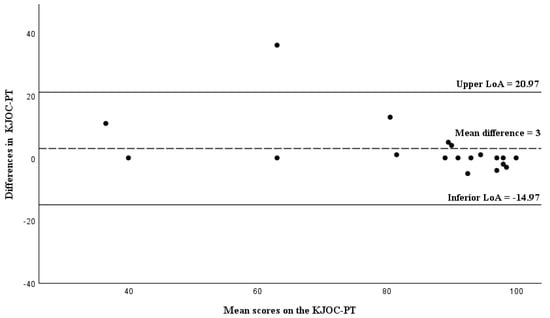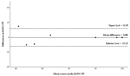 Background/Objectives: The Kerlan-Jobe Orthopaedic Clinic Shoulder & Elbow Score (KJOC) is used to identify dysfunctions and estimate injury risk in overhead sports athletes. Although it has been validated in several countries, a European Portuguese version is currently unavailable. This study aimed to translate, culturally adapt and assess psychometric properties (validity and reliability) of the European Portuguese KJOC (KJOC-PT). Methods: The KJOC-PT was translated and culturally adapted according to international guidelines. One hundred athletes were selected (median age 24 [IQR 17] years, 72% male) and divided into two groups: asymptomatic and symptomatic athletes. The convergent validity was assessed by correlating the KJOC-PT with the Disabilities of the Arm, Shoulder and Hand (DASH) and DASH-Sports. 31 athletes from the initial sample were considered to assess between-day reliability and agreement (Bland-Altman analysis). Floor and ceiling effects were also calculated. Sampling adequacy was assessed using the Kaiser Meyer-Olkin (KMO) test. Results: Minor cultural and linguistic changes were made in the KJOC-PT. This version demonstrated excellent internal consistency (Cronbach’s α = 0.91 to 0.97) and moderate negative correlations for validity (KJOC-PT with DASH, rho = −0.595; with DASH-Sports, rho = −0.533, both p < 0.001). Good reliability (ICC2,1 = 0.77 to 0.89 [95%CI 0.36 to 0.96]), measurement error (SEM = 4.11 to 6.90; MDC = 11.39 to 19.13) and mean difference ranging from −0.08 ± 6.14 to 3 ± 9.17 were found. No floor effect (0%) and ceiling effects of 24.2% for the total sample (50% for asymptomatic and 5.1% for symptomatic athletes) were found. Conclusions: KJOC-PT is now available and is a valid and reliable instrument for use by athletes in overhead sports.