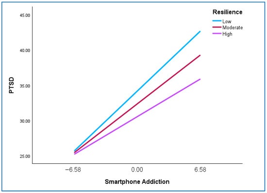 Background: Problematic smartphone use has emerged as a growing concern among young adults and has been linked to adverse mental health outcomes. However, limited research has examined how protective factors such as resilience may buffer the relationship between smartphone addiction and post-traumatic stress disorder (PTSD). Methods: Participants (n = 491, age = 21.22 years) were students enrolled at a university in the Western Cape province of South Africa. They completed three standardized measures: the Smartphone Application-Based Addiction Scale, the Connor–Davidson Resilience Scale-10, and the Posttraumatic Stress Disorder Checklist for DSM-5. Moderation analyses were conducted using the PROCESS macro for SPSS to examine whether resilience moderated the association between smartphone addiction and post-traumatic stress symptoms. Results: Higher levels of smartphone addiction were significantly associated with elevated PTSD symptoms across all clusters. Resilience emerged as a significant protective factor, exerting direct effects on several PTSD symptom clusters and moderating the association between smartphone addiction and the avoidance and negative alterations in cognition and mood clusters. However, resilience did not significantly moderate the relationship between smartphone addiction and the re-experiencing or hyperarousal clusters, suggesting that these physiologically driven aspects of post-traumatic distress are less amenable to cognitive or emotional coping resources. Conclusions: These findings highlight resilience as a key buffer in the relationship between problematic smartphone use and trauma-related distress. While strengthening resilience may mitigate certain cognitive and affective dimensions of PTSD associated with excessive smartphone use, interventions may need to incorporate strategies to effectively address hyperarousal and intrusive re-experiencing symptoms among trauma-exposed students.