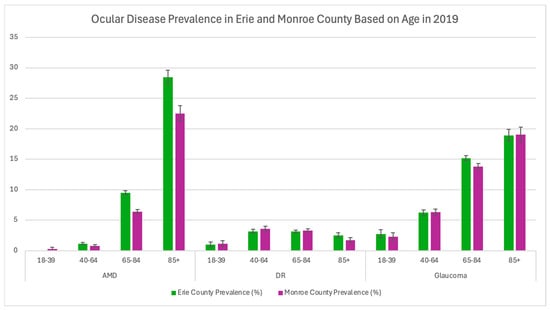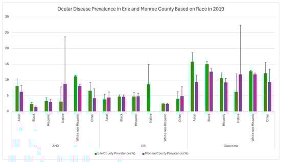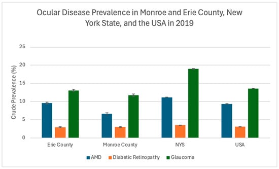 Background/Objectives: As the world becomes more connected, it is becoming critical for clinicians to understand other cultures, races, and ethnicities to provide the most effective therapy. A comprehensive understanding of all communities necessitates an examination of the social determinants of health (SDH). Eye diseases and many other conditions are influenced by SDH. To elucidate the impact of SDH on eye health, a comparative ecological analysis of Monroe and Erie Counties in New York State was conducted to identify any differences in SDH and glaucoma, age-related macular degeneration (AMD), and diabetic retinopathy prevalence. Methods: The CDC Vision and Eye Health Surveillance System (VEHSS) was utilized to collect glaucoma, AMD, and diabetic retinopathy data in Monroe and Erie Counties, New York State, and the USA for 2019. The American Community Survey, County Health Rankings, and Neighborhood Atlas data portals were used to collect the county socioeconomic demographics, along with other health statistics. Results: Overall, Erie County had a higher prevalence of AMD (9.56% vs. 6.61%, p < 0.0001) and glaucoma (13.05% vs. 11.71%, p < 0.0001) compared to Monroe County. Erie County also had a higher prevalence of AMD and glaucoma across all races, aside from North American Natives. Erie County also had a greater primary care shortage, with only 1 primary care physician for every 1230 individuals. Although income inequality and poverty were similar between Erie and Monroe Counties, Erie County also has more racial segregation regarding the residential layout (ranked 74 on a scale of 0 to 100, with 100 being the most segregated). Conclusions: The results indicate that Erie County had an increased prevalence of AMD and glaucoma compared to Monroe County in 2019, along with a greater primary care shortage. Although this analysis targeted Western New York, disparities such as lack of primary care access and segregation are prevalent across the US, necessitating widespread action to address these problems.
