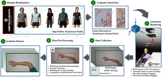 Background: Precise localization of acupuncture points (acupoints) is crucial for the clinical success of Traditional Korean Medicine (TKM). Traditional methods that rely on visual inspection and palpation are subjective and prone to inter- and intra-observer differences, making standardization challenging. The progress of data-driven localization techniques is also limited by the scarcity of annotated datasets and inconsistent labeling quality. Objective: This study presents MetaAcuPoint, a synthetic dataset created to overcome these limitations by providing high-fidelity, anatomically consistent hand images for acupoint localization. Methods: MetaAcuPoint was generated using MetaHuman avatars within Unreal Engine, resulting in 900 RGB hand images. Anatomically aligned, bone-attached sockets were implemented for five diagnostically relevant hand acupoints, ensuring millimeter-level precision and spatial consistency across various hand poses. Dataset validity was assessed by training a high-resolution network (HRNet-W48) within the MMPose framework and testing its performance on real-world forearm images. Results: The synthetic-trained model achieved a mean distance error (MDE) of 5.67 ± 3.13 pixels, closely aligning with the real-data baseline at 4.81 ± 2.85 pixels. Adding synthetic samples to real data further enhanced performance (MDE: 4.95 pixels). In contrast, manually annotated synthetic images yielded poorer results (MDE: 12.76 pixels), emphasizing the advantages of automated anatomical annotation. Generalization tests across four external datasets confirmed that the synthetic data-trained model outperformed the real-data-trained model, maintaining higher accuracy (MDE: 5.84–6.45 mm vs. 10.63–15.80 mm). Conclusions: MetaAcuPoint demonstrates the first example of synthetic-to-real generalization for hand acupoint localization. By combining photorealistic rendering with anatomically grounded annotation, the dataset offers a reliable resource to promote standardized, data-driven approaches in acupuncture research and practice.
