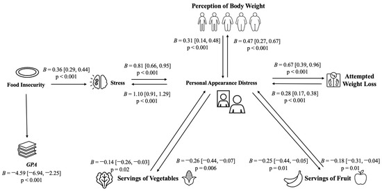 Given the nexus between food insecurity and body dissatisfaction, a deeper understanding of this complex relationship in college students is needed. The purpose of this cross-sectional study, using the American College Health Association—National College and Health Assessment 2021 (n = 2003) at a large public university, was to explore the associations between food insecurity, personal appearance distress, and compensatory behaviors associated with body dissatisfaction. An analysis of variance with Tukey’s post hoc comparisons was performed to assess the relationship of outcomes associated with personal appearance distress by food security status. Structural equation modeling, using multivariable logistic and ordinal regression, were constructed to explore the impact of personal appearance distress, perception of body weight, weight control attempts, and dietary behaviors, adjusting for age, sex, race/ethnicity, body mass index, and food security status. Food insecurity was associated with lower grade point average, higher overall stress, and personal appearance distress. Personal appearance distress was associated with fewer servings of vegetables (p = 0.006) and fruits (p = 0.01), higher perceived body weight (p < 0.001), and more weight modification attempts (p < 0.05). The associations between food insecurity, personal appearance distress, and compensatory behaviors could extend to disordered eating behaviors, necessitating awareness and interventions from college campus programming and administration.