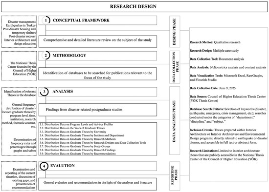 Disaster is a multidimensional phenomenon affecting societies worldwide. Rising climate crises, mass migrations, and earthquake risks have made disaster awareness crucial in spatial design. In this context, interior architecture has evolved beyond esthetic and functional concerns into a discipline that contributes to post-disaster recovery and quality of life. This study examines disaster- and earthquake-themed postgraduate theses in interior architecture in Türkiye to identify academic trends and methodological orientations. Drawing on Türkiye’s distinctive disaster history, it highlights the need for a global perspective in post-disaster spatial design and disaster-conscious interior architecture education. Using a mixed-method approach combining both quantitative and qualitative analyses and a multiple case study model, data were collected through document analysis from the Council of Higher Education’s National Thesis Center. The sample includes 33 theses published between 2003 and 2024, analyzed by year, university, institute, advisor title, program level, research method, and thematic focus. Findings indicate a notable increase in disaster-oriented studies after 2021, particularly following the 6 February 2023 earthquakes. Most are master’s theses under Institutes of Science, dominated by qualitative methods. The analysis identifies temporary housing, modular systems, sustainability, and psychosocial recovery as recurrent themes, indicating an increasingly human-centered research focus in Türkiye.