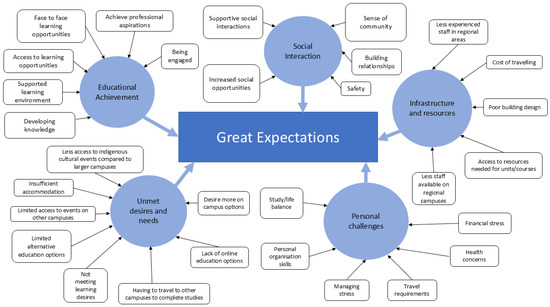 Studying at a university regional campus presents unique opportunities, challenges, and experiences for students. People who live in rural and regional areas are less likely to gain a tertiary degree, and barriers include access, cost, and competing priorities and aspirations. Students are often from lower socio-economic status backgrounds, first in family, and have diverse caring responsibilities, needing a different approach to support when entering higher education. Many studies focus on transitions to higher education for a commencing student. However, student expectations of and engagement in their studies at a regional university are under-researched. Four cross-discipline researchers conducted a pilot study to determine the feasibility of a larger project investigating students’ expectations and experiences of studying at University of Tasmania’s regional Cradle Coast Campus to identify how to better support students in the first two years of their degrees. An online survey collected responses from students commencing a degree through on-campus study. Data were thematically analysed using recurrent abstraction. Five themes emerged under the overarching theme of great expectations. Data contributes to understanding the relevance of Kahu and Nelson’s framework, of student engagement in a regional context. Consideration of these findings will assist in supporting and engaging regional people in higher education.