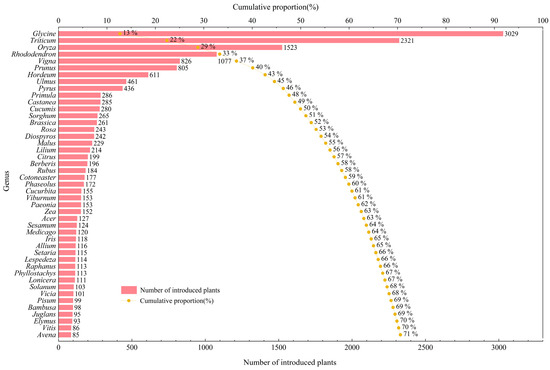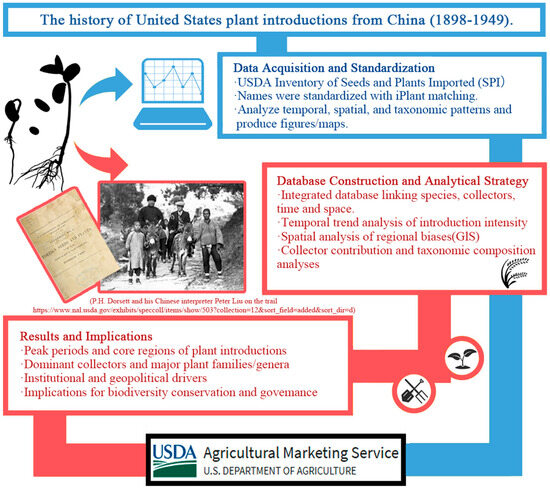 Since the 19th century, the United States has continuously conducted plant introductions from around the world to expand high-quality germplasm resources for agriculture and horticulture. Beginning in 1898, China—shaped by millennia of agrarian civilization and characterized by exceptionally rich biodiversity—became a key focus of these efforts. To clarify the historical trajectory of the introduction of plants originating in China into the U.S., this study compiles the Office of Foreign Seed and Plant Introduction series Inventory of Seeds and Plants Imported (The Inventory of Seeds and Plants Imported is a serial publication compiled by the SPI since 1898, documenting plant introduction activities of the United States worldwide. The original volumes and their digitized versions are publicly accessible through the USDA National Agricultural Library (NAL) Digital Collections. These archival records constitute the primary source of the historical plant-introduction data used in this study.) and synthesizes the history of introductions from 1898 to 1949; after verifying and analyzing the composition and selectivity of introduced taxa in terms of scientific nomenclature, spatiotemporal distribution, collectors, taxonomic structure, and plant uses, we find that 23,890 introduction records were documented, encompassing 159 families, 869 genera, and 2252 species, spanning 34 provincial-level administrative regions and 230 prefecture-level cities in China, with more than 566 collectors participating over nearly half a century, among whom F. N. Meyer, J. F. Rock, P. H. Dorsett, W. J. Morse, and F. A. McClure made particularly prominent contributions. Plant introductions from China enriched U.S. germplasm collections, expanded the genetic and functional diversity of U.S. plant resources, and reshaped the composition of agricultural and landscape systems.