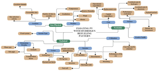 The escalating global demand for electricity, coupled with environmental concerns and economic considerations, has driven the exploration of alternative energy sources, creating competition for land with other sectors. A comprehensive analysis of a 10 MW floating photovoltaic (FPV) system deployed across different Köppen climate zones along with techno-economic analysis involves evaluating technical efficiency and economic viability. Technical parameters are assessed using PVsyst simulation and HOMER Pro. While, economic analysis considers return on investment, net present value, internal rate of return, and payback period. Results indicate that temperate and dry zones exhibit significant electricity generation potential from an FPV. The study outlines the payback period with the lowest being 5.7 years, emphasizing the system’s environmental benefits by reducing water loss in the form of evaporation. The system is further integrated with hydrogen generation while estimating the number of cars that can be refueled at each location, with the highest amount of hydrogen production being 292,817 kg/year, refueling more than 100 cars per day. This leads to an LCOH of GBP 2.84/kg for 20 years. Additionally, the comparison across different Koppen climate zones suggests that, even with the high soiling losses, dry climate has substantial potential; producing up to 18,829,587 kWh/year of electricity and 292,817 kg/year of hydrogen. However, factors such as high inflation can reduce the return on investment to as low as 13.8%. The integration of FPV with hydropower plants is suggested for enhanced power generation, reaffirming its potential to contribute to a sustainable energy future while addressing the UN’s SDG7, SDG9, SDG13, and SDG15.