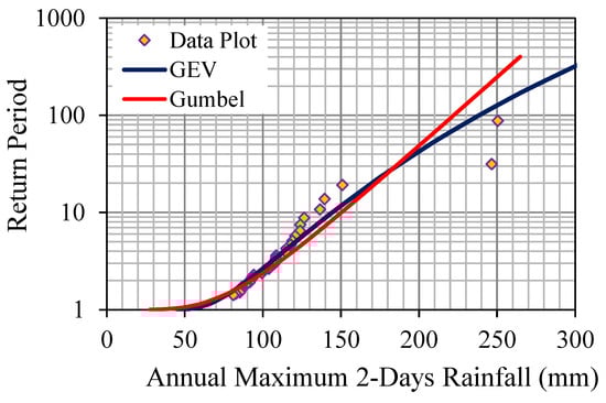 Flood frequency analysis is essential for designing resilient hydraulic infrastructure, but traditional stationary models fail to capture the influence of climate variability and land-use change. This study applies a bivariate logistic model with non-stationary marginals to eight gauging stations in Sinaloa, Mexico, each with over 30 years of maximum discharge records. We compared stationary and non-stationary Gumbel and Generalized Extreme Value (GEV) distributions, along with their bivariate combinations. Results show that the non-stationary bivariate GEV–Gumbel distribution provided the best overall performance according to AIC. Importantly, GEV and Gumbel marginals captured site-specific differences: GEV was most suitable for sites with highly variable extremes, while Gumbel offered a robust fit for more regular records. At station 10086, where a significant increasing trend was detected by the Mann–Kendall and Spearman tests, the stationary GEV estimated a 50-year return flow of 772.66 m3/s, while the non-stationary model projected 861.00 m3/s for 2075. Under stationary assumptions, this discharge would be underestimated, occurring every ~30 years by 2075. These findings demonstrate that ignoring non-stationarity leads to systematic underestimation of design floods, while non-stationary bivariate models provide more reliable, policy-relevant estimates for climate adaptation and infrastructure safety.