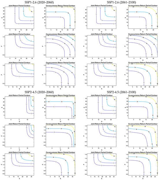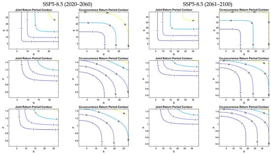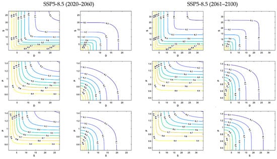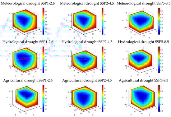As global climate change intensifies, understanding drought mechanisms is crucial for managing water resources and agriculture. This study employs the Standardized Precipitation–Actual Evapotranspiration Index (SPAEI), Standardized Runoff Index (SRI), and Standardized Soil Moisture Index (SSMI) to analyze meteorological, hydrological, and agricultural droughts in the lower Songhua River basin. The PLUS model was used to predict future land types, with model accuracy validated using four evaluation metrics. The projected land cover was integrated with CMIP6 data into the SWAT model to simulate future runoff, which was used to calculate future SRI. Drought events were extracted using run theory, while drought occurrence probability and return period were calculated via a Copula-based joint distribution model. Bayesian conditional probability was employed to explore propagation mechanisms. The results indicate a significant increase in multidimensional drought risk, particularly when the cumulative frequency of univariate droughts reaches 25%, 50%, or 75%. Although increased duration and intensity enhance the likelihood of combined droughts, extremely high values cause a decline in joint probability under “OR” and “AND” conditions. Under different climate scenarios, the recurrence intervals of meteorological, hydrological, and agricultural droughts in the lower reaches of the Songhua River exhibit increased sensitivity with severity, demonstrating consistent propagation patterns across the meteorological–hydrological–agricultural system. Meteorological drought was found to propagate to hydrological and agricultural drought within ~6.00 months and ~3.67 months, respectively, with severity amplifying this effect. Propagation thresholds between drought types decreased with increasing intensity. This study combined SWAT and CMIP6 models with PLUS-based land-use scenarios, highlighting that land-use changes significantly influence spatiotemporal drought patterns. Model validation (Kappa = 0.83, OA = 0.92) confirmed robust predictive accuracy. Overall, this study proposes a multidimensional drought risk model integrating Copula and Bayesian networks, offering valuable insights for drought management under climate change.