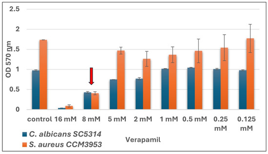 SMIC50 (minimal inhibitory concentration) (marked with arrow) of VER to biofilms of C. albicans SC 5314 (blue) and S. aureus CCM3953 (orange).