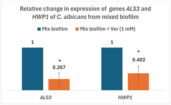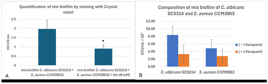 Verapamil (VER) is a calcium channel blocker used to treat cardiovascular diseases. However, some studies also suggest its antimicrobial potential. Changes in calcium abundance in yeasts can lead to decreased expression of transcription factors for genes related to morphology, resistance, and biofilm. Hyphal growth in Candida albicans is necessary for biofilm formation, especially in mixed biofilms with Staphylococcus aureus. This research studied the antibiofilm activity of VER in mixed biofilms of C. albicans SC5314 and S. aureus CCM3953. First, the minimal inhibitory concentration of VER was determined for single-species biofilms. Subsequently, a subinhibitory concentration of VER (1 mM) was tested on mixed biofilms. Biomass was reduced by 20% for C. albicans and 30% for S. aureus. The morphology of C. albicans was altered, and a decrease in S. aureus cells was also observed. qPCR was used to determine changes in HWP1 and ALS3 gene expression in biofilms formed w/wo VER. A decrease in the expression of both genes was observed. In vivo experiments with Galleria mellonella confirmed the antibiofilm activity of VER against mixed infections of C. albicans and S. aureus. These results suggest that VER regulates the morphology of C. albicans, resulting in changes in biofilm composition and the adhesion of S. aureus.