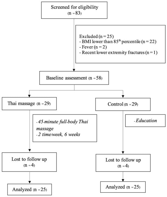 Background: Prolonged obesity in children can lead to a gradual decline in postural stability due to changes in biomechanics, musculoskeletal function, and neuromuscular control. Early interventions may help address these issues. This exploratory study examined the potential influence of Thai massage on postural stability in children with overweight and obesity. Methods: This study employed a quasi-experimental, comparative design and was conducted at the Pa Tueng Sub-district Health Promoting Hospital, Chiang Rai, Thailand. A total of 58 children meeting the criteria for overweight or obesity were systematically assigned to either the Thai massage group or the control group based on the order in which they were recruited. The Thai massage group received 45 min full-body Thai massage sessions combined with stretching exercises twice a week for six weeks (a total of 12 sessions), while the control group was advised to perform daily stretching exercises at home. Postural stability was assessed by measuring sway path length and sway velocity during double-leg and single-leg stances with eyes closed, both before and after the intervention. Results: While no statistically significant differences were found between the groups, the Thai massage group exhibited a non-significant trend toward reduced sway path length and sway velocity, whereas the control group showed a significant increase in both measures (p < 0.05), indicating a decline in postural stability over time. Conclusions: These findings suggest that Thai massage showed a potential trend toward stabilizing postural stability in children with overweight and obesity; however, the between-group differences were not statistically significant. As an exploratory study, further research with longer intervention durations and follow-up assessments is needed to determine whether clinically meaningful effects can be established.