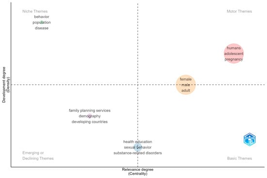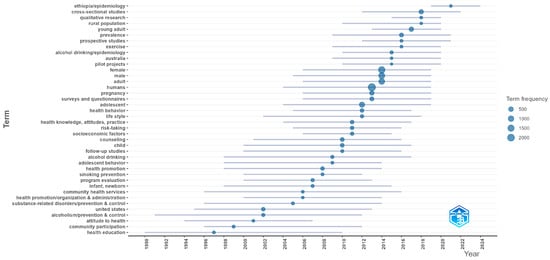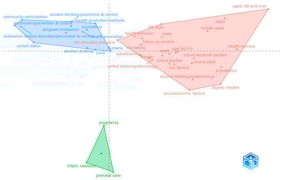 The aim of this study was to map global research on community-based strategies to reduce risky alcohol consumption and promote health, aiming to clarify growth, leading contributors, thematic structure, and integration with public-health frameworks. Using a PubMed corpus, we analyzed production, authorship, and collaboration indicators, built a thematic map (centrality/density) to identify core topics, and applied Multiple Correspondence Analysis to assess conceptual proximity between alcohol-specific and broader prevention domains. The dataset comprised 2607 documents across 916 sources, with output led by the USA, with substantial contributions from Australia, Canada, the UK, and rising activity in sub-Saharan Africa. The thematic map showed a mature core centered on adolescents and pregnancy, cross-cutting foundations in health education and sexual behavior with substance-related disorders, measurement-oriented niches at the periphery, and emerging work linking family planning. The Multiple Correspondence Analysis positioned alcohol-prevention terms close to health promotion, primary prevention, and epidemiology, with maternal–child health bridging community programs and clinical prevention. Overall, community-based alcohol prevention is expanding, globally distributed, and embedded in mainstream public-health practice. Limitations include the absence of citation data in PubMed, and future work should integrate citation-enabled databases and compare patterns across income groups.