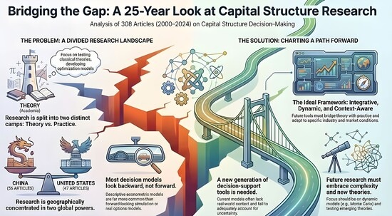 This paper presents a bibliometric analysis and literature review of methodologies for optimal capital structure decision making, focusing on research published between 2000 and 2024. This study reviews current research, identifies gaps, and outlines a plan to support with financial decisions. A mixed-methods approach was employed, combining data from the Web of Science and Scopus databases using the search string “capital structure” AND (“decision making” OR “optimal structure”). The study used Bibliometrix(R), VOSviewer, and NVivo tools, and followed the Preferred Reporting Items for Systematic Reviews and Meta-Analyses (PRISMA) flowchart for choosing studies. The findings show that this field is well-developed but still changing. The intellectual structure is organized around two main clusters: one focused on testing classical theories and another oriented toward optimization and managerial applications, revealing a clear theory–practice divide. The mapping also highlights the dominance of Chinese and U.S. scholarship and the central role of practitioner-oriented journals such as Managerial Finance, indicating both a shift toward emerging markets and a strong demand for applicable research. The study provides three key contributions. First, it identifies important countries, authors, outlets, and themes. Second, it uses a method that combines bibliometric and text-mining tools. Third, it introduces a new decision-support framework that is thorough, context-sensitive, and flexible. There are some limitations. These include relying on Scopus and Web of Science, language limits, and the fact that bibliometrics cannot judge the quality of methods. Future research should empirically validate the proposed framework in different contexts, expand studies in emerging markets, test emerging theories such as Brusov–Filatova–Orekhova (BFO) theory, and develop more dynamic and stochastic models to better capture financial uncertainty.