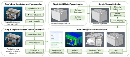 The automatic reconstruction of existing buildings has gained momentum through the integration of Building Information Modeling (BIM) into architecture, engineering, and construction (AEC) workflows. This study presents a hybrid methodology that combines deep learning with surface-based techniques to automate the generation of 3D
